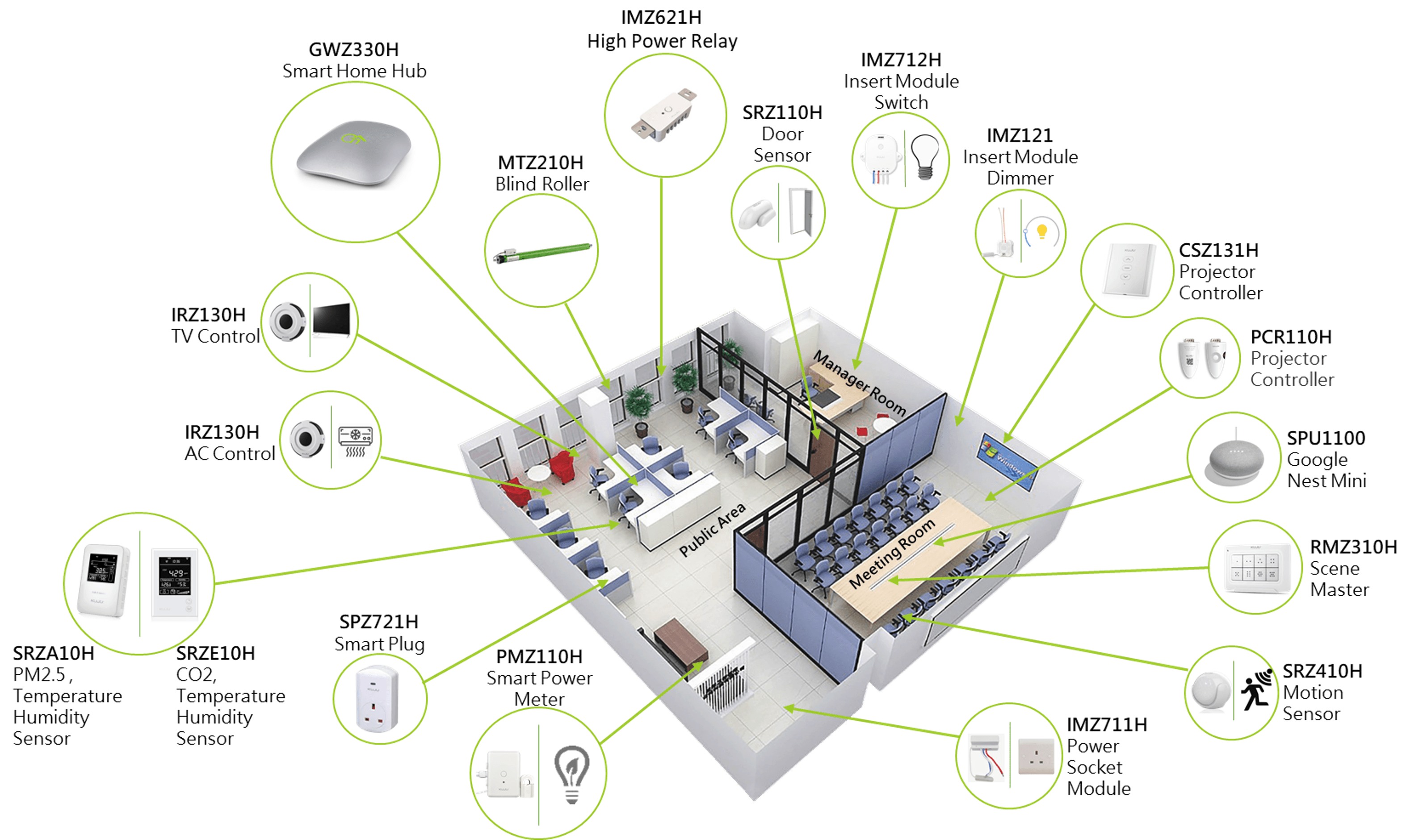 系統支援IoT物聯網技術,能夠自動化控制照明、空調、門禁等設備。